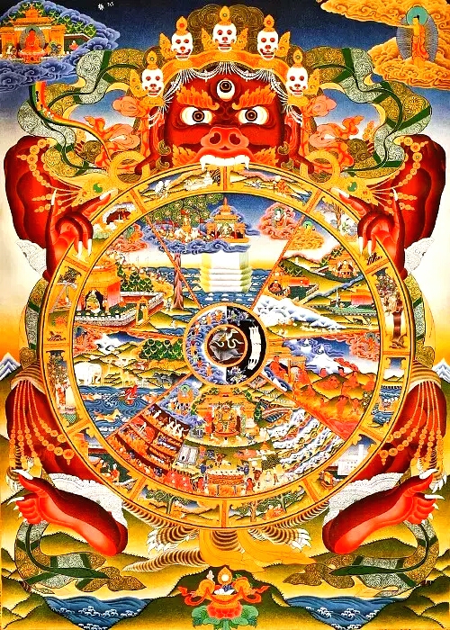 有情众生心常计较,所以心里升起了什么念头,造作了什么业力,就会牵引到什么道去受生。这种受生会因为个人造作了不同的业力而歧路各别,从此走上了不同的轮回路。每个众生追随各自业力分散到各个道中,因为很多时候众生是混居在一起的,所以多有交集;在宿业福报上互有高低,投生受生后也有了不同的境遇。在三毒的作用下愚痴蒙蔽,得势便猖狂,加害他人或者暴殄天物,处于高位则伤害他人。他伤害完众生,众生就要找机会报仇,待他势力衰弱命终,或者处于低位了,就要去偿还对众生犯下的过错,从而形成了一副庞杂的微细的无边浩瀚巨大的轮回众生图。